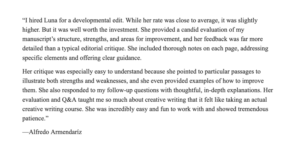Welcome! My name is Luna, and I would love to be the editor for your book. Having an editor for your book is an invaluable service. This service makes the book more attractive to publishers, far more likely for your ideas to connect with your readers, and helps you grow immeasurably as a writer, editor, and human being.